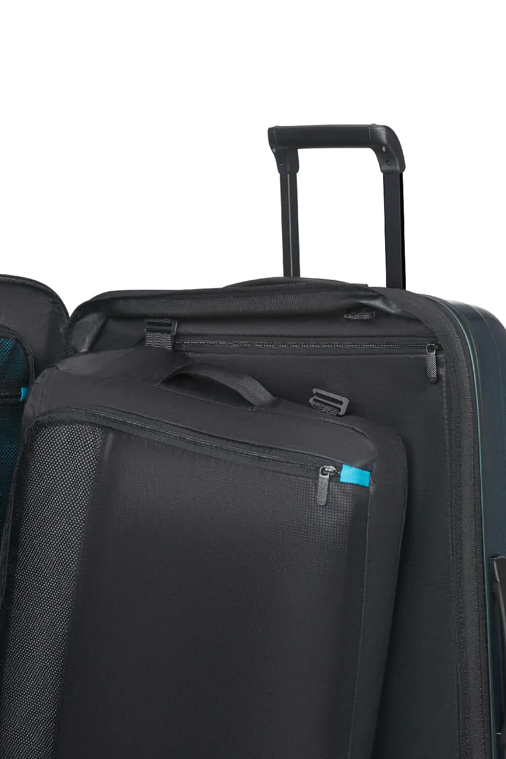 Внутрішній простір оптимізований для максимально зручного пакування. Нижнє відділення оснащене ременями для фіксації одягу, що запобігає його зміщенню під час транспортування. Верхня частина закривається текстильною перегородкою на блискавці з додатковою кишенею для дрібних речей. Підкладка виконана з якісного текстилю з фірмовим візерунком Samsonite, що підкреслює преміальний статус моделі. Бічні елементи конструкції додають жорсткості корпусу та забезпечують додатковий комфорт під час пакування.